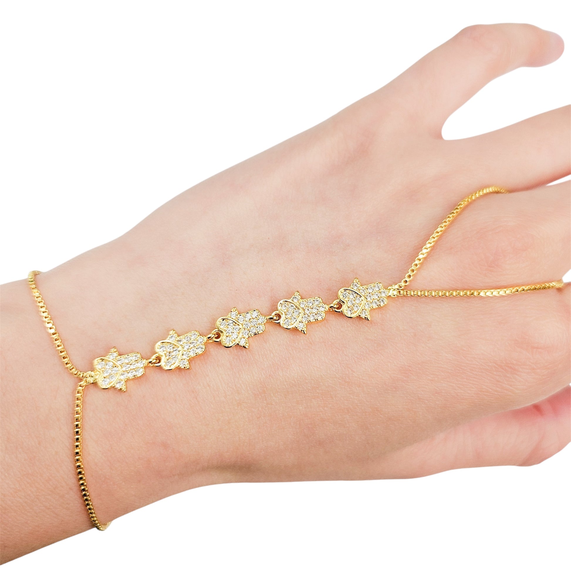 This gold plated hand chain features hearts on the palm of the hamsa. The hamsa symbolizes protection, blessings, and good fortune, while the heart symbolizes love and compassion.