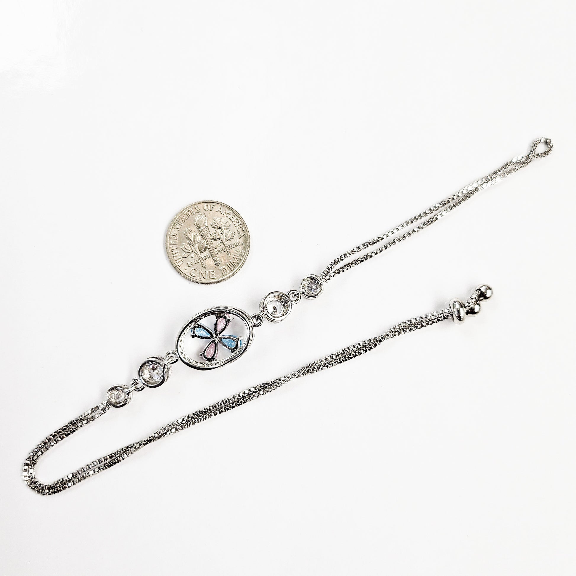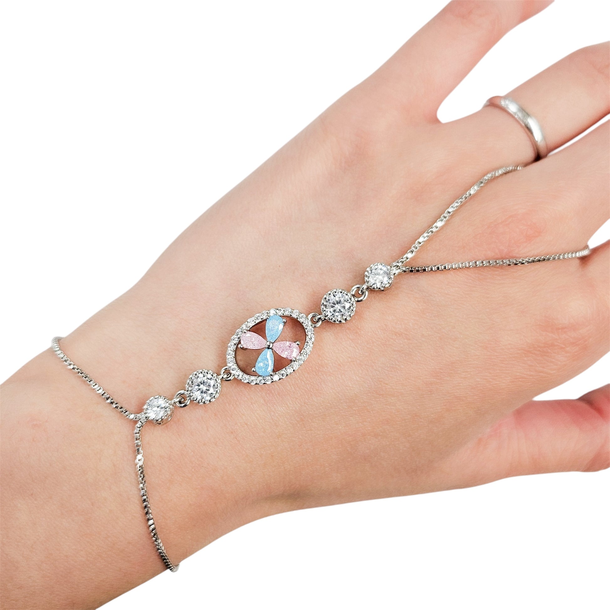 Add a playful splash of color to your look with the Blue Pink Pinwheel Flower Handchain. This delicate accessory features vibrant blue and pink hues arranged in a charming pinwheel flower design. It effortlessly enhances any outfit with a unique touch of elegance and whimsy.