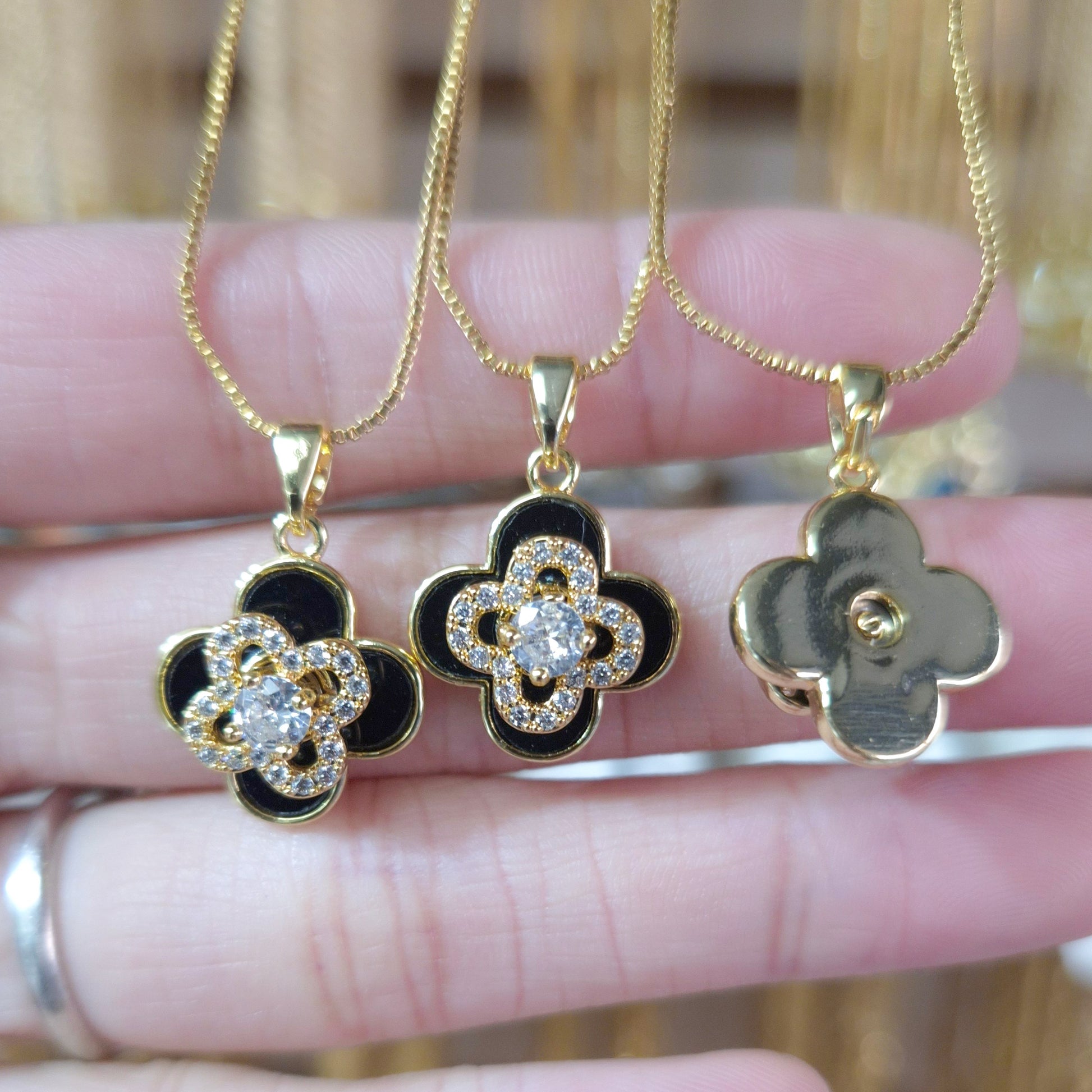Black Enamel Bedazzled Clover Spinner Necklace